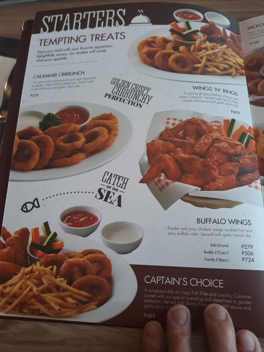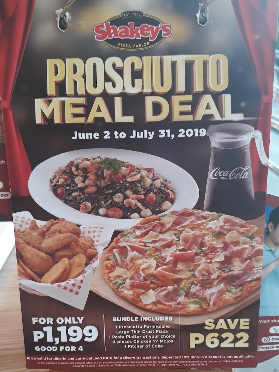 Chicken, Mojos, Carbonara with Garlic Bread, Hawaiian Delight or Pepperoni pizza.Shakey's Favorites All-in-One Plate.