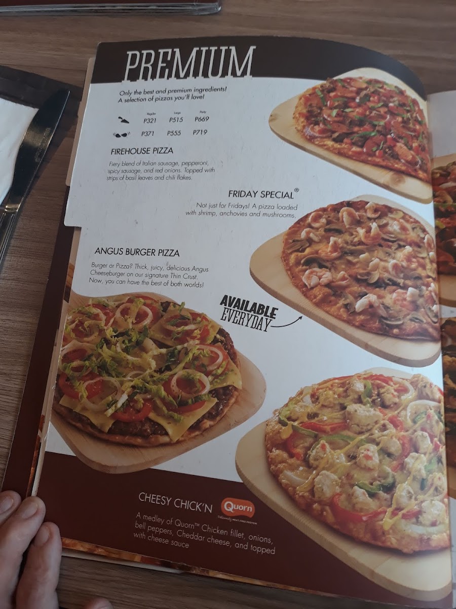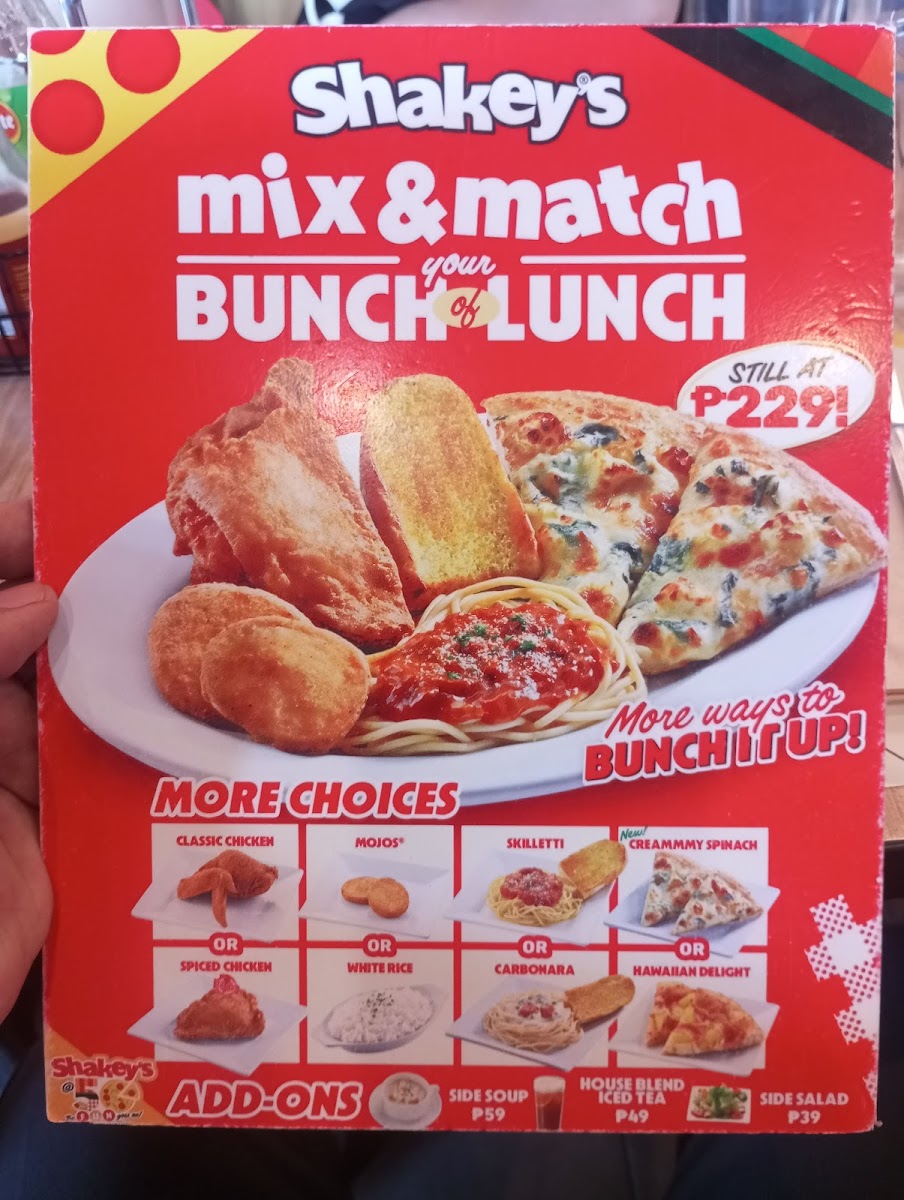 Chicken,Rice, Carbonara with Garlic Bread, Hawaiian Delight or Pepperoni pizza. Shakey's Favorites All-in-One Plate.
