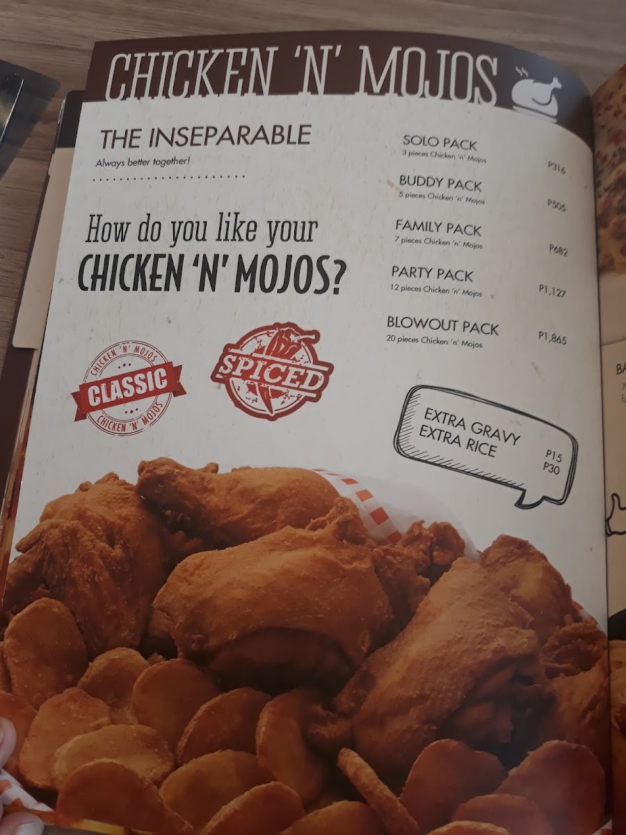 When it comes to chicken, the Chicken N Mojos section provides a variety of family-sized packs and individual servings such as the Family Pack, 2 Pcs Chicken 'N' Rice, and Solo Pack, all paired with crispy and delicious Mojos. For extra indulgence, you can opt for add-ons like Extra Rice, Gravy, or Garlic Ranch Dip to complement your meal.